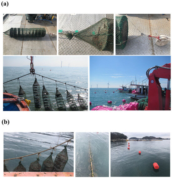 Deployment of the scallop lantern cages at (a) offshore wind farm and (b) Tongyeong Megacosm Test Station.