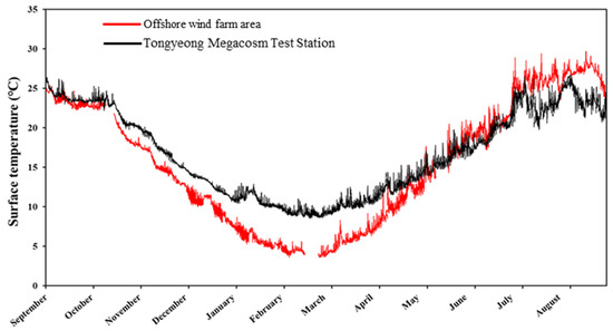 Surface seawater temperature data (from September 2021 to August 2022) were obtained from offshore buoys installed in Tongyeong Yeonhwa-do (34.6672 N, 128.3847 E) and Buan Wi-do (35.6584 N, 126.2610 E), which are adjacent to Tongyeong Megacosm Test Station and the OWF area (data provided by the Real-time Information System for Aquaculture environment from National Institute of Fisheries Science, South Korea) (Figure 3).