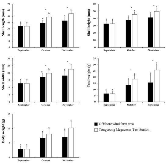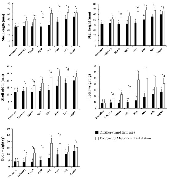 Bar plots depicting the comparisons of changes in size (shell length, height, width, total weight, and body weight) of Argopecten irradians from month to month. The letters indicate a significant difference for different months in the same region (p < 0.05). The symbol “*” indicates significant differences by region in the same month (p < 0.05). All values represent mean ± standard deviation (SD).