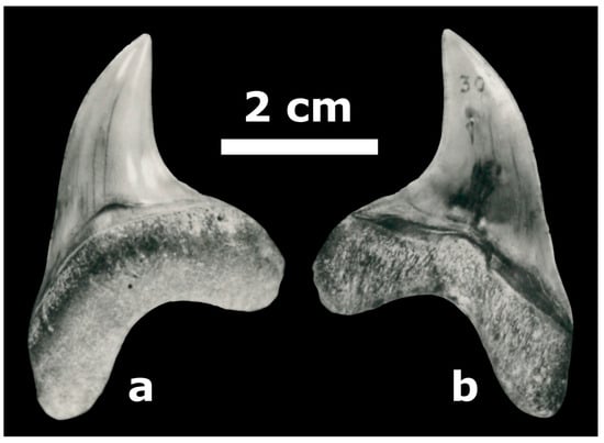 Parotodus benedenii, tooth from the historical “Lawley Collection” of Tuscan Pliocene fossils kept in the Museo di Storia Naturale dell’Università di Pisa, in (a) lingual and (b) labial views. Identified by Landini ([]: pl. XVI[V]: figure 16) with the specimen code M.P.P.1.6.[3], this tooth was reported therein as having been assigned to Oxyrhina quadrans by Roberto Lawley. Reproduced from Landini ([]: pl. III, figure 3).