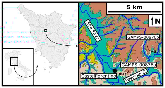 The Valdelsa Basin is a 25 × 60 km, NW–SE trending extensional basin of central-western Tuscany. Its sedimentary infill accounts for some 1000 m of continental and marine deposits that range chronostratigraphically from the Upper Miocene to the Lower Pleistocene []. A detailed sequence stratigraphic framework exists for the Valdelsa Basin, which allows for dividing its sedimentary infill into seven different synthems, namely, S1–S7 from older to younger [].
