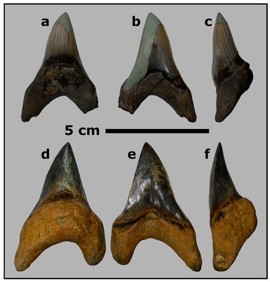 Parotodus benedenii, Tuscan Pliocene teeth kept in the Museo Geopaleontologico Scienze della Terra—Gruppo AVIS Mineralogia e Paleontologia Scandicci. (a–c) GAMPS-00876a, a partial tooth from Upper Pliocene deposits cropping out at an abandoned quarry in the vicinity of Castelfiorentino (Florence Province), in (a) lingual, (b) labial and (c) mesial views (note that the crown was partly reconstructed with grey plasticine). (d–f) GAMPS-00876b, an essentially complete tooth from ?Upper Pliocene deposits cropping out at a cultivated field in the vicinity of Montespertoli (Florence Province), in (d) lingual, (e) labial and (f) mesial views.