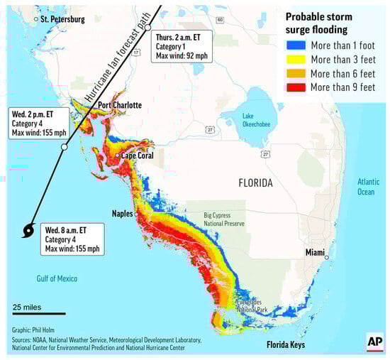 - NOAA’s Updated P-Surge Model. Available online: https://slosh.nws.noaa.gov/psurge/index.php?S=Psurgetest22023&Adv (accessed on 10 August 2023).