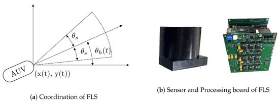 where denotes the AUV’s prior heading angle. The parameter signifies the maximum detection range of the FLS and represents the AUV’s initial heading angle.