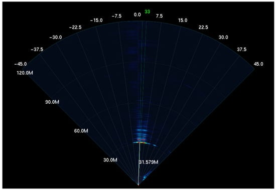 In the present investigation, the characteristics of the FLS sensor were incorporated to enhance the accuracy of the path planning for AUVs. The FLS sensor, integrated into the LIG AUV, covers a scanning ambit of 120 degrees, systematically segmented into 60 bins. Each bin, with an angular breadth of 2 degrees, furnishes data on five discrete distances. Furthermore, the vertical scanning range of the sensor extends to 15 degrees. The fundamental coordination of the FLS is depicted in Figure 1a and images captured from the actual sensor are presented in Figure 2. Within these figures, obstacles are denoted by a red dot, whereas dots of varying colors signify reflections of diminished intensity. The designated search angle in the figure is 90 degrees with a maximum detectable range of 100 m. As a result, the FLS of the LIG Nex1 AUV produces a matrix, denoted as , described as: