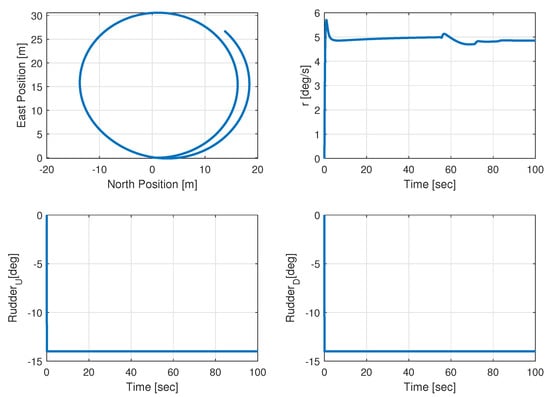 Figure 4 presents the results of the simulation of the maximum rotation at 3 kt from the stabilized motion model mentioned above. While a driving control command for rotation was given at 6 degr/s, it can be observed that the maximum rotational speed is limited to 5 deg/s. The maximum deflection angle of the rudder is limited to 14 degrees and maintains this maximum angle during rotation, as shown in Figure 4. The maximum rotation angle was calculated based on the maximum rotation angular velocity obtained from the simulation, utilizing the FLS’s maximum detection distance and speed u as follows: