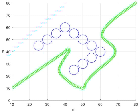 A comprehensive performance assessment of the path-generation algorithm was performed through simulations. These simulations were designed to both evaluate the algorithm’s efficacy against generic obstacle patterns and test its robustness in overcoming obstacles leading to local minima. The primary objective is to empirically validate its robustness and feasibility. For consistency, each simulation was conducted under the assumption that the dimensions of the underwater environment are (100 m × 100 m). Furthermore, the AUV is abstracted as a particle with a radius of 2 m. The threshold bias value, , is designated as . This value sufficiently satisfies the condition given by Equation (25) in Theorem 2, particularly as remains below across all underwater environmental points.