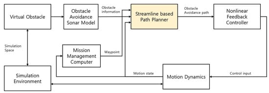 To determine whether the proposed route is easily navigable for the autonomous underwater vehicle, a simulation that integrates both the control algorithm and the motion model is essential. To implement the proposed obstacle generation technique in the actual control algorithm, a simulation framework was designed, as shown in Figure 9, which encompasses the AUV’s motion dynamics, path-planning algorithm and virtual obstacle management. The motion dynamics, calculated in real-time, utilize a 6-degrees-of-freedom equation to derive the AUV’s posture and position. The Mission Management module orchestrates AUV operations and formulates the overarching mission trajectory. Within this simulated environment, the dynamics and obstacle data converge to generate virtual obstacles, currently focusing solely on circular-shaped challenges. The obstacle avoidance sonar model, mirroring the functionalities of the FLS, identifies these virtual impediments and provides pertinent data. Core path planning, capitalizing on a streamline-based algorithm, discerns optimal traversal paths and depths. The entire navigation process culminates with a nonlinear controller guiding the AUV based on this predetermined trajectory and depth. All components were conceptualized and instantiated using MATLAB.