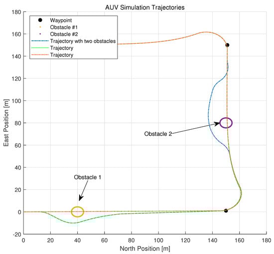 Figure 7 and Figure 8 represent scenarios with increased navigational complexity. The algorithm consistently produces reliable avoidance paths in the majority of these complicated cases. Ensuring an AUV’s precision in following the designated trajectory is paramount.