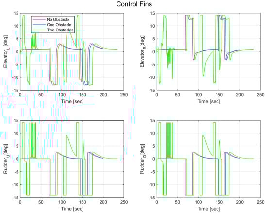 Figure 10 illustrates the trajectories of an AUV travelling at 4 knots and navigating between waypoints 150 m apart, with a sonar detecting range of 30 m and a maximum turning angle of . The strategic placement of obstacles modulated the trajectories and the changes were highlighted. Additionally, Figure 11 shows the control output fluctuations due to depth changes for avoiding obstacles. Complicated paths may make control angles to their limits, possibly slowing down the AUV and increasing energy usage. As more obstacles are added, the navigation path lengthens, causing the control panel’s operation to slow down. The chattering phenomenon in the control angle is not due to the generated path but is inherent to the nonlinear controller’s characteristics. During actual navigation, many sensors provide directional input. To robustly handle this input, the controller has an uncontrolled region set, which leads to the chattering effect. The occurrence of chatter indicates a small error between the commanded and actual path, suggesting that the path is easily navigable for the autonomous underwater vehicle. Upon the second obstacle avoidance, one can observe a pronounced curve in the path as illustrated in Figure 10. However, examining the rudder angle shows that while it briefly maintains its maximum value for the initial rotation maneuver, it does not utilize the entire deflection angle for the subsequent path control. This indicates that the proposed path is traceable. The reason for maintaining the initial maximum deflection is to alter the initial direction, a phenomenon executed to avoid rapid obstacles.
