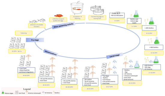 The newly hatched larvae should be moved to a rearing tank, where they show a pronounced tendency to sink, conserving a uniform dispersion in the water body [78]. Directly after hatching, the digestive tract will still be incomplete, the mouth will be closed, and the eyes will not be pigmented yet. Throughout this phase, the larvae rely on their yolk sac [86]. Once the visual and digestive organs are fully developed, the larvae are involved in progressively active movements characterizing the first-feeding predatory position [86]. Thus, they can initiate their feeding on live prey from the third to the fourth day of hatching, initially consuming Branchionus spp. (Rotifers), and subsequently transitioning to Artemia (Brine shrimp) [87]. In addition, during the first 25 DPH, a microalgal culture, so-called green water, is added to tanks, where it is used to feed directly the rotifer and thus indirectly feed the larvae, or this may work as a water quality conditioner, holding the water quality attributes at optimum ranges, and as an immunological stimulus, minimizing bacteriological contamination and the nitrogen concentration [85,87,88]. The production of the “green water” involves the use of specific species, namely Isochrysis galbana, Tetracelmis suecica, Nannochloropsis gadinota, and Nannochloropsis oculta. These species are selected for their high protein contents, strong production capabilities, and lack of adverse side effects. Several key parameters significantly impact the growth and production rates of microalgae. These include the temperature and salinity levels, which should be maintained within the ranges of 18 °C to 24 °C and 20 and 35 ppt, respectively. Moreover, 1000 to 2000 lux’s light intensity ensures optimal algal growth. Furthermore, maintaining the pH level in the range of 7.5 to 8.5 is essential to encourage the algae’s desired growth and production rates [85].
