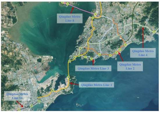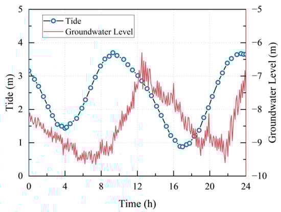 As a transitional zone between the continental interiors and the open ocean, coastal regions represent the most economically dynamic and project-intensive areas in China []. Due to the complex hydrogeological conditions in coastal regions, the use of internal bracing systems for supporting coastal foundation pits is essential [,,]. Taking the example of metro construction in the coastal city of Qingdao in northern China, a large number of coastal metro foundation pits, as shown in Figure 1, have been formed in urban development in recent years to meet the requirements of economic development and transportation []. These foundation pits face numerous engineering challenges, such as the fluctuation of groundwater levels []. The phenomenon of coastal tides leads to continuous changes in the groundwater levels around the foundation pits, as depicted in Figure 2, significantly impacting the safety of the support structures [,,,]. Since rivers in coastal areas are usually connected to the sea, tidal-induced changes in the river’s water level can even affect foundation pits that are relatively far from the sea. Consequently, the majority of coastal metro foundation pits in the Qingdao region are supported using internal concrete bracing systems [,,].