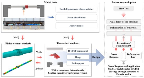 This study proposes a prefabricated H-CFST interior bracing system for coastal foundation pits such that the interior bracing system consists of the H-CFST components, hoops, and end supports. The flowchart of the experimental research plan is shown in Figure 3.