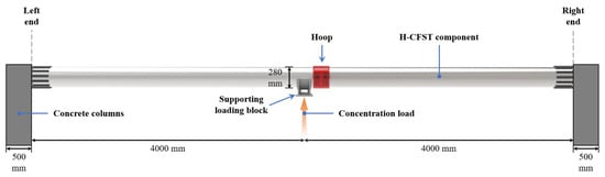 The experimental model had a length of 9000 mm and a calculated span of 8000 mm. The mid-span section of the experimental model had a diameter of 280 mm, and the wall thickness of the steel tube was 2.4 mm. In order to investigate the performance of bracing under transverse bending, a concentrated force was applied at the intermediate node adjacent to the hoop connection in the middle of the span. The concentrated load was applied using a special supporting loading block so as to avoid local failure in the region of the load introduction and to better simulate the loading in the on-site system.