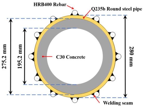 This paper reports the development of a test specimen that is on a scale of 1/2.5 of the coastal foundation pit bracing of a Qingdao Metro Line 8 station, taking into account the best site conditions available for the test. The original bracing was designed to have the same strength as the corresponding concrete bracing. It had a length of 20 m and was divided into left and right H-CFST components, with the two H-CFST components connected by the self-designed “hoop”. The H-CFST component was of Q355B steel, the outer diameter was 700 mm, and the wall thickness of the steel tube was 6 mm. The fabrication of the concrete core of grade C80 material with 100 mm wall thickness applied centrifugal technology. The hoop was 35 mm thick and made of Q355B material. The end supports consisted of 30 HRB400 steel bars with a diameter of 20 mm, which overlapped with the steel bars inside the top beam. A schematic diagram of the experimental model is shown in Figure 4.