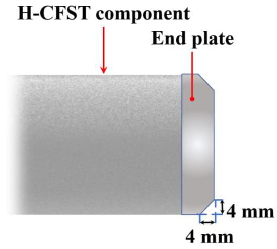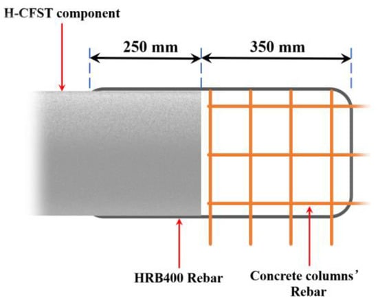 The two parts of the prefabricated H-CFST bracing model used for the experiment were similar, and they were connected with a hoop. Their steel material was Q235B, and the internal filling was of grade C30 concrete. The cross-section of the bracing reduced to a scale of 1/2.5 of the original size is shown in Figure 5. The H-CFST component model overlapped with the reinforcement cage of the columns of both ends and was fixed after the poured concrete hardened. One end of 12 HRB400 steel bars with a diameter of 20 mm was welded to the steel pipe of the H-CFST component model, and the other end overlapped with the reinforcement cage inside the column, as shown in Figure 6. Moreover, end plates of 10 mm thickness were set at the nodes at both ends of the bracing to prevent concrete from being injected into the bracing during pouring. The size of the end plate is shown in Figure 7. The schematic diagram of the intermediate node (Hoop) connection is shown in Figure 8.