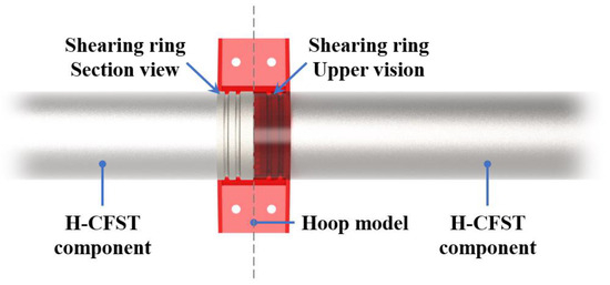Two H-CFST component models were connected using a hoop of two-halves connected with bolts, and the dimensions are shown in Figure 9.
