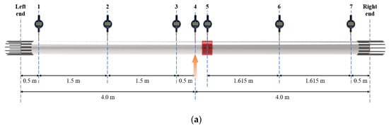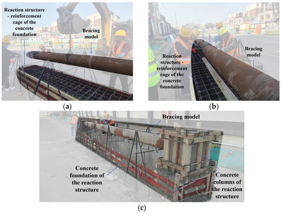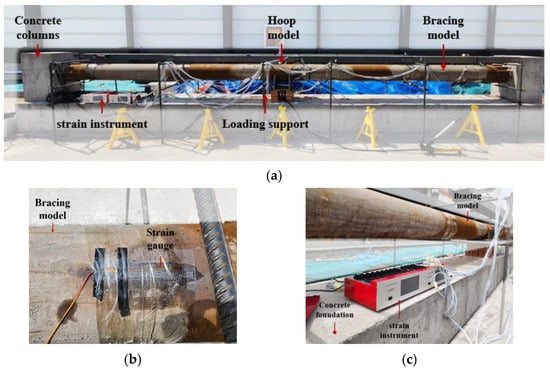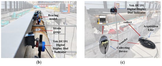 The displacements of the bracing were measured using the CVok-DU191 digital display dial gauges and their supporting instrument (Xiwaka Precision Measuring Instrument Co., Ltd., Dongguan, China), having a range of 100 mm and accuracy of 0.01 mm. A total of 7 monitoring sections were arranged on the bracing, and the positions of the sections are shown in Figure 14a. The layout of the experimental model and the general arrangement of the displacement measurements are shown in Figure 14b,c.