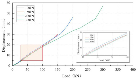 It can be seen that the vertical displacement of the model gradually increased with the increasing test load, and the slopes of each curve were almost equal when the load was less than 150 kN. Compared with the curves of 100 kN and 150 kN, the curves of 200 kN and 300 kN showed a sudden increase in the slope at the later state of loading, and the variation could be divided into two phases, of which the first was is the elastic phase, where the vertical displacement showed a linear correlation with the test load. The second phase was the elastoplastic one, where the steel tube of the H-CFST component began to yield and the vertical displacement of the member accelerated with the increasing test load, resulting in a gradually increasing slope of the curve. This is consistent with the description in reference []. It is worth noting that the curves of 200 kN and 300 kN had different starting points at the elastoplastic stage. The starting point of the 200 kN curve was about 150 kN, and that of the 300 kN curve was about 200 kN. The reason for this is that the yield strength of the steel tube in the experimental model experiences strain hardening when loaded up to 200 kN. This is consistent with the description in references [,,].