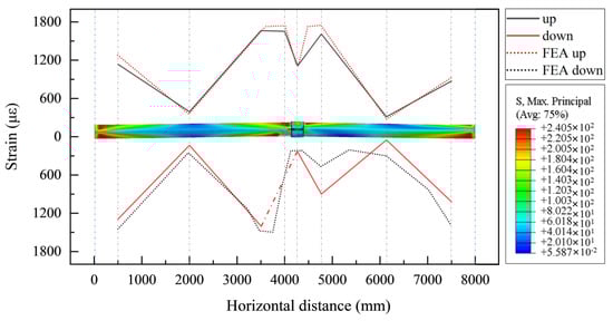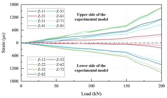 Figure 16 presents the development of strains at each measuring point up to a maximum load of 200 kN, and a good working state was maintained at each measuring point while the strains at the upper and lower measuring points of the experimental model increased with the load.