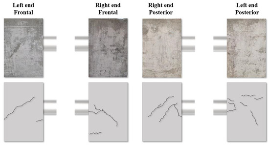 After increasing the maximum load to 300 kN, cracks appeared on columns of both ends for the supporting reactions of the bracing member, as shown in Figure 18. The cracks basically extended 45° outward from the connection between the bracing model and the column.