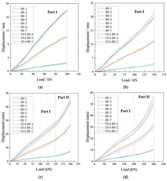 Figure 17 presents the distribution of inelastic deformations in the test model at loadings to different maximum values. The model undergoes inelastic deformation after unloading from 150 kN, with a maximum value of 1.95 mm at BF-4. When unloading from 200 kN, inelastic deformations occurred at all seven measuring points. When loading up to 300 kN, the inelastic deformations developed rapidly, with a maximum value of 32.53 mm at BF-4 and a minimum value of 5.50 mm at BF-1. The displacement values of each measuring point were strictly symmetrical with respect to the loading point.