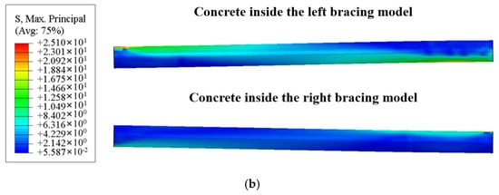 Based on the above results, with no damage to other components, the hoop could bear a significantly greater load than the other components. Therefore, the cost-effectiveness of prefabricated H-CFST bracing could be improved further by optimizing the wall thickness of the hoop, which was 14 mm in the experimental model. If d is the wall thickness of the hoop representing the same stiffness and strength as the H-CFST component, then d = 7 mm. Figure 23 presents the results of the FEM analyses for this thickness. It could be seen that the central section of the upper hoop and one side of the steel pipe yielded simultaneously.
