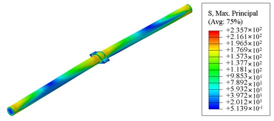 Nephogram of the distribution of stresses in the bracing model when the wall thickness of the hoop is 7 mm.