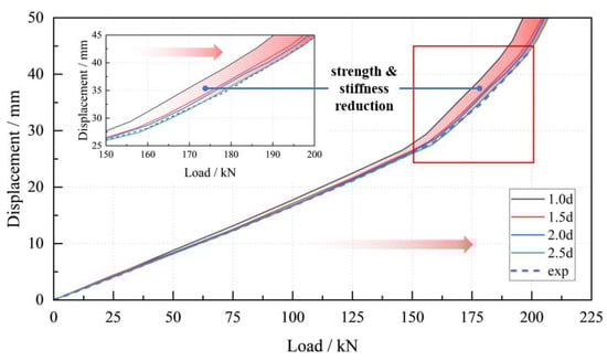 Figure 24 presents the load-displacement diagrams of the prefabricated H-CFST bracing system with thickness values of 1 d, 1.5 d, 2.0 d, and 2.5 d on the basis of the FEM simulations.