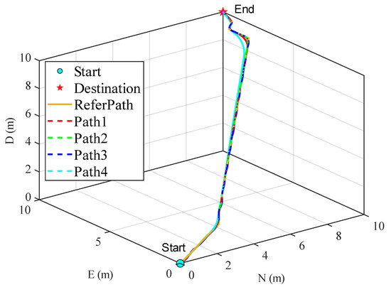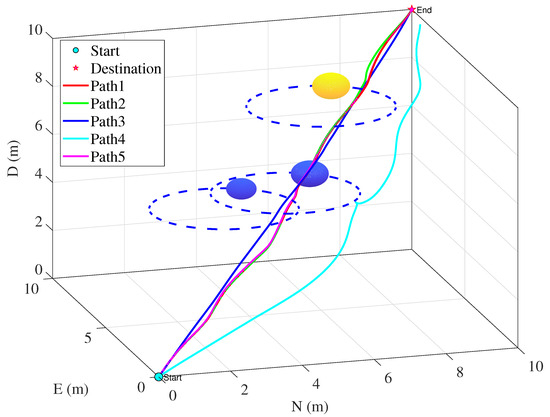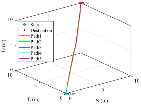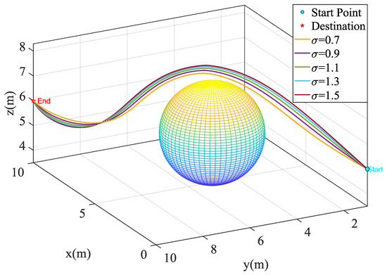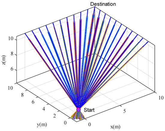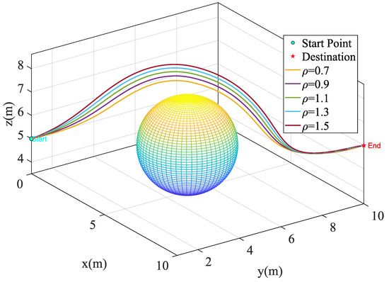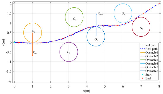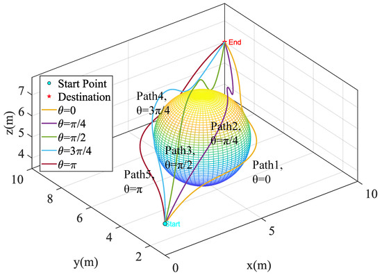 Among them, is the sampling control period. A smaller value of leads to more accurate results, but it also increases computational complexity. The parameters , , and shape the streamlines. Adjusting and avoids stagnation points and traps.