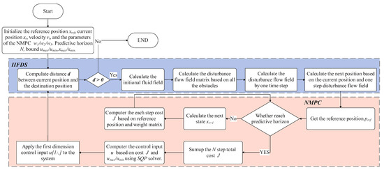 . The reference path dynamically changes based on the movement of the plant and the distance between obstacles. If there are any dynamic obstacles present, the corresponding fluid velocity is adjusted accordingly. The inner-loop NMPC controller then follows the receding path. This process can be described in the following steps: