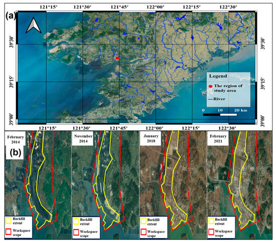 The region of study area: (a) the location of the study site; (b) the satellite image of the progress of land reclamation.