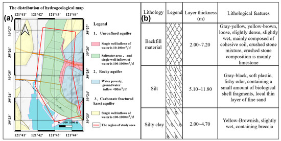 (a) The distribution of hydrogeological map; (b) comprehensive lithology column chart of backfill area.