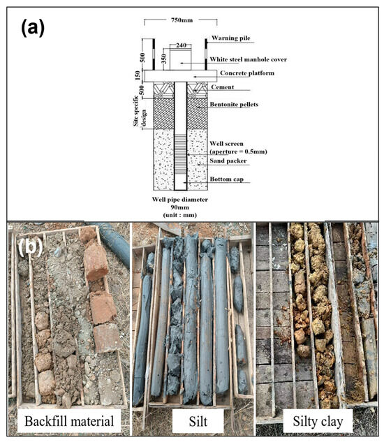 The groundwater monitoring wells were designed and constructed to satisfy the requirement of the site groundwater measurement [29]. As shown in Figure 4a, the well casing is made of PVC, where the casing material is chemically inert to prevent any reactions with the groundwater. The well screen is a perforated section of the casing that allows water to enter the well while keeping out sediment. The annular space is filled with a filter material like coarse sand, sealed with bentonite and cement grout to prevent surface water from entering the well. The filter material is washed quartz sand with a particle size of 1–2 mm. Above ground, a wellhead is installed in order to avoid unauthorized access and to protect the well from surface contaminants. The logging of the drilling bore is essential in the construction of groundwater monitoring wells. As drilling progresses, the types of soil encountered are recorded. This lithological log helps in understanding the subsurface geology and aids in the design of the well, particularly the placement of the well screen, as shown in Figure 4b.