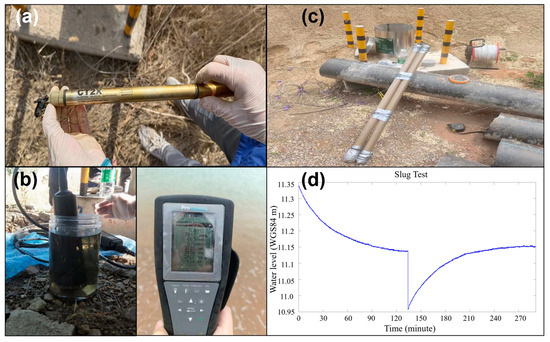 (a) The data log for the pressure, salinity, and temperature measurement; (b) the YSI@ instrument measures the parameters of groundwater; (c) the image of the slug test; (d) slug test water level change data.