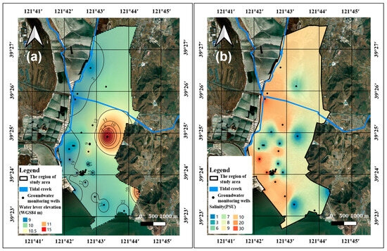 (a) The distribution of the groundwater table in November 2022; (b) the distribution of the groundwater salinity in November 2022.