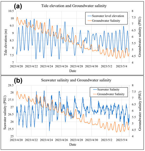 Conversely, during the low tide period, the reduced sea level and hydrostatic pressure allow for a natural flushing mechanism. This leads to a decrease in salinity levels as less saline and, often fresher, groundwater displaces the intruded seawater. This hydrodynamic process was observed at our study site, as shown in Figure 8. The fluctuation range of the tidal water level is roughly between 7.5 m and 10.0 m, the average amplitude is 2.25 m, the fluctuation range of seawater salinity is approximately 25.5–28 PSU, and the average amplitude is 2.25 PSU. The fluctuation of groundwater salinity range during the observation period is roughly 4.25–7.5 PSU, and the amplitude is 0.25 PSU. The tide serves as the hydrodynamic condition facilitating the interaction between seawater and subsurface freshwater. The tidal cycles lead to periodic fluctuations in groundwater level. However, the extent to which this flushing occurs can be influenced by various factors such as the aquifer’s geological characteristics, existing groundwater flow patterns, and the presence of any barriers to flow, like clay layers or anthropogenic structures.