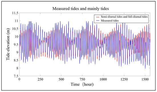 The purpose of harmonic analysis is to determine the set of An, fn, and n that could best fit the observed data. The harmonic analyses applied to the discrete temporal sequences aim to quantify the amplitudes and phases of groundwater variation and major tidal constituents within the observed data [39]. Due to the constantly changing positions of the Moon and celestial bodies, their distance from the Earth is continuously changing, so the movement of the Moon relative to the Earth is very complex. Their motion has so many cycles, and there are long and short periods in the same kind of cycle. According to the principle of small amplitude wave superposition, the vibration of the complex cycle of tidal waves can be represented by the sum of simple harmonic vibrations caused by a series of individual forces. The four main tides are M2, S2, K1, and O1, and their periods are 12.42 h, 12.00 h, 23.93 h, and 25.82 h, respectively. These four main tides are extracted from the original data, which are about as similar as 90% to the original measured tide data, as shown in Figure 9. Utilizing harmonic analysis, the composite waveforms in these records were decomposed in relation to specific periodicities that are well established in astronomical data. Data spanning a 63-day interval, from 19 March 2023 to 22 May 2023, encompassing both tidal and groundwater level records, were collected and subsequently segregated into their individual tidal constituents [40].