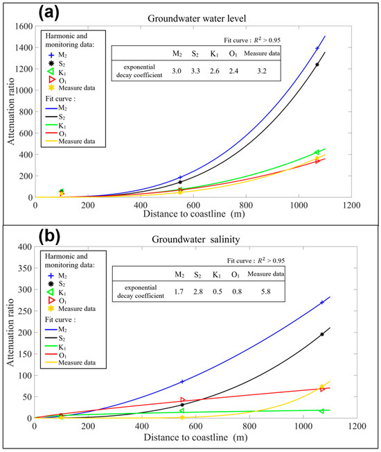 The amplitude of the groundwater level oscillation diminishes with increasing distance from the coast, signifying a reduced tidal influence [41]. The attenuation ratio is applied to characterize the diminishing amplitude of groundwater level. This ratio is calculated as the proportion between the tidal amplitude and the corresponding groundwater level at the monitoring wells. The higher the attenuation ratio, the more significantly the associated groundwater fluctuations are reduced. The attenuation ratio for the salinity is considered in this study as well. The approach of the least squares method is used to find the best-fitting curve to the calculated set of attenuation ratios at different wells. Exponential functions are obtained to optimize the best-fitting parameters. All the R squares are higher than 95%.