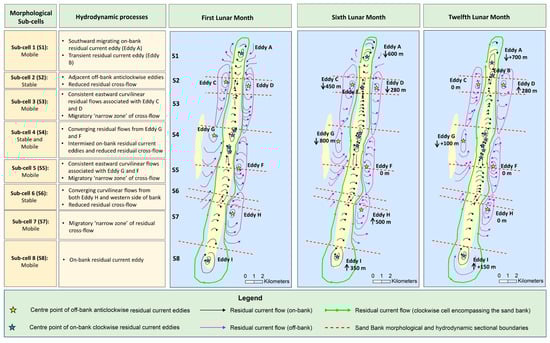 - A high-level clockwise residual circular eddy encompassing the whole bank, caused by flood/ebb tidal dominance, and multiple smaller-scale on-bank clockwise residual eddies, both of which unevenly distribute sediment within the sediment budget cell.