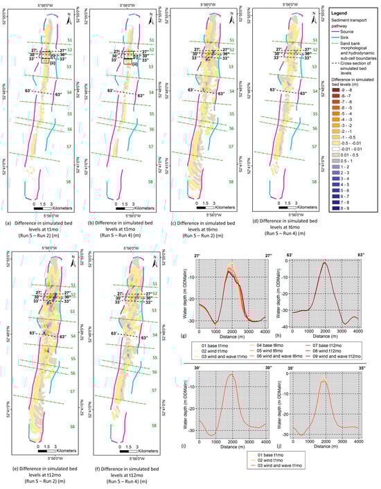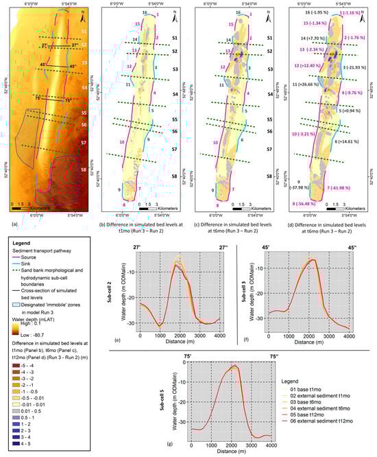- The areas of the bank most vulnerable to changes in external sediment sources and the addition of wind and wave forcing are quite consistent. These areas generally align with those regions identified as ‘mobile’ zones in Creane et al. [17] and display a relatively high residual current crossflow under pure current baseline conditions.