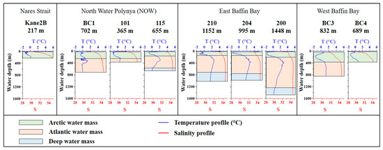Water masses in the Baffin Bay have two origins, the Arctic Ocean and Atlantic Ocean. Figure 2 shows temperature and salinity profiles measured at each station allowing us to differentiate water masses in the area. In the Kane Basin, cold and low salinity Arctic water mass (<0 °C; <34) dominates. This Arctic water mass reaches 300 m depth to the northern and the western parts of the Baffin Bay but is shallower in the east, affecting the 200 first meters of the water column.
