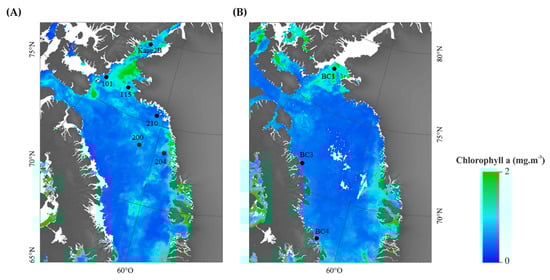 Phytoplankton biomass in the studied area mainly gathers to the western and northern parts of the Baffin Bay, in the NOW area, and in Nares Strait (Figure 3). Chl. a concentrations in these areas reach 2 mg·m−3. Figure 3 shows that in July 2014, phytoplankton biomass seems to be more important than in September 2015. The NOW is the most productive zone of the studied area [53,54,69]. Following a significant phytoplankton bloom that grows during the months of May and June, the phytoplankton biomass starts to decrease in July and August, then fades slowly from September [51].