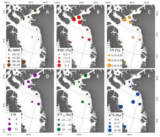 δ15N measured in sediments is used to trace the relative use of nitrogen (NO3−) in surface waters, an essential nutrient for primary production [83,84,85]. It depends on nitrogen isotopic composition in the surface water mass and isotope fractionation from phytoplankton assimilation of nitrogen nutrients. In the photic zone, phytoplankton uses preferentially isotopically weak nitrogen (14NO3−). In addition, Fox and Walker [86] indicate that sinking particulate organic matter reaches the deep ocean within a few days in the Baffin Bay. We can consider that N is well preserved in surface sediments and that δ15N provides direct information on primary productivity and nutrient availability in the surface ocean. Our results indicate that δ15N is slightly different between the Baffin Bay, with values of 7 to 9‰, and the NOW and Nares Strait areas, with weaker values of 5 to 6‰ (Figure 4). Despite it being an intense biological activity in the polynya, nutrient-rich Pacific water from the Arctic Ocean allows the maintenance of relatively weak δ15N values. On the other hand, δ15N values measured in sediments of the Baffin Bay are higher, suggesting a lower availability in nutrients in surface waters from the North Atlantic.