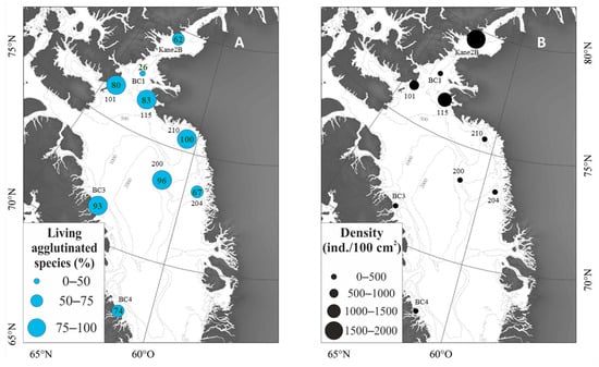 (A) Proportion of living agglutinated species and (B) density of living benthic foraminifera per 100 cm2 for each studied station.