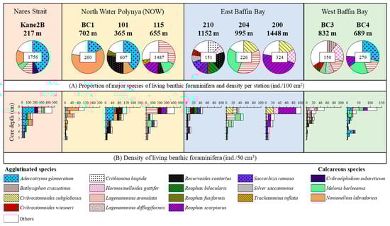 Densities of living fauna for each core expressed in number of individuals per 100 cm2 are shown in Figure 5B and in the middle of the pie charts in Figure 6A. The weakest densities are noticed in the Baffin Bay (150 to 324 ind./100 cm2) and at station BC1 (260 ind./100 cm2). Densities are higher in NOW, with a density higher than 1000 ind./100 cm2 at station 115. The highest density is noticed at station Kane2B with 1754 ind./100 cm2.