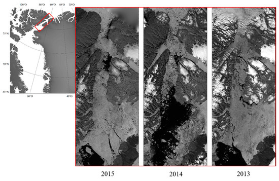 Sea ice cover in Nares Strait in July 2015 (left), 2014 (middle), and 2013 (right) from satellite images MODIS Terra. Note the unusual situation during the summer of 2014 with the Kane Basin being relatively free of ice.