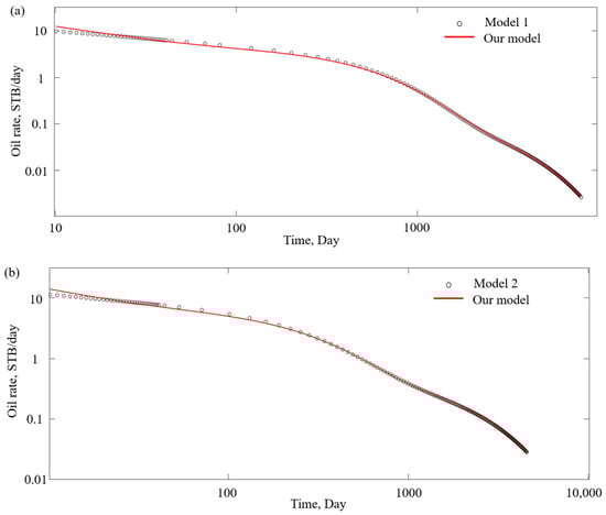 The comparison results between two numerical models and the analytical solution are presented in Figure 3. The black dots indicate the results of oil rate over time as calculated by the numerical models, while the red lines indicate the results of the analytical solution. Obviously, the fitting results are excellent. As shown in Figure 3a,b, four flow regimes are both identified. Because of the high-velocity flow in the hydraulic fracture region (Region 1), the two flow regimes happened in Region 1 are not presented. The first regime can be diagnosed as a transient linear flow in Region 2, which also corresponds to the −1/2 straight line presented on the log–log plot. Region 2 is the stimulated region with relatively high permeability, which is significant for short-term production of the reservoir, so the linear flow time in this region is 418 days in Model 1 and 244 days in Model 2, respectively. The exponential curve representing the second flow regime indicates that the pressure wave reaches the boundary of Region 2. As for the third flow regime, it indicates the transient linear flow in Region 3 with a low-permeability matrix, which contributes significantly to long-term production, so the linear flow time in this region is 1869 days in Model 1 and 1389 days in Model 2, respectively. Lastly, the fourth flow regime is outer boundary-dominated flow. The six output parameters from the fit to two numerical models are listed in Table 2.