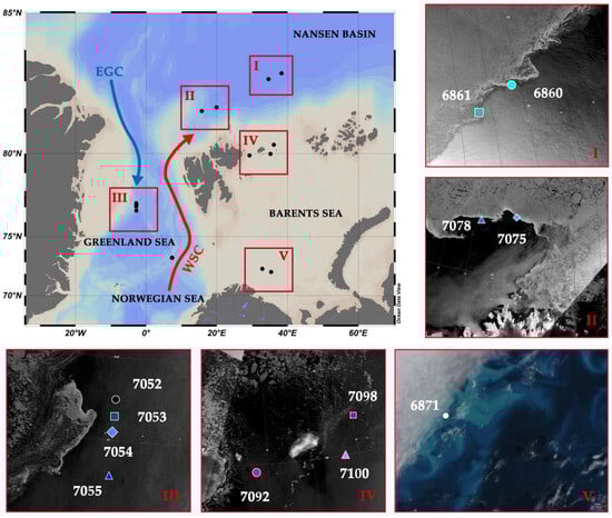 Location of stations sampled in the marginal ice zone and southern areas of the European Arctic seas in August 2020 and 2021. Schematic of main current flow—the East Greenland current (EGC) and the West Spitsbergen current (WSC). Fragments of Sentinel-1A/B quasi-synchronous radar images retrieved for days of sampling in the MIZ (areas I, II, III and IV). No satellite imagery for the Emiliania huxleyi bloom area (V) for days of sampling in 2021.