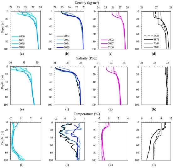 Vertical profiles of density (kg∙m−3), salinity (PSU) and temperature (°C) in the five areas: Nansen Basin (a,e,i), Greenland Sea (b,f,j), Barents Sea (c,g,k) and the southern areas of the Norwegian and Barents Seas (d,h,l). The color of each profile shows the sampling station as at Figure 1. The stratification was salinity dependent within the marginal ice zone and defined by warming in the southern areas.